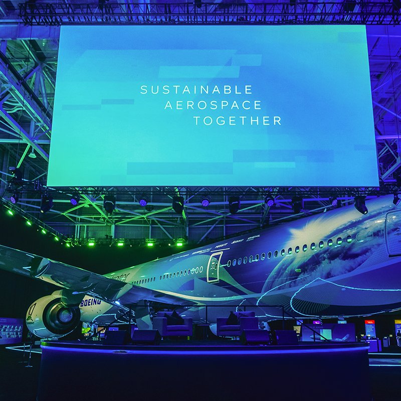 In partnership with the Financial Times, Boeing hosted industry leaders to explore the future of sustainable aviation. The event was held in an airplane hangar, and included live presentations, informative activations and displays, a global broadcast, and a Boeing 777-212ER aircraft.